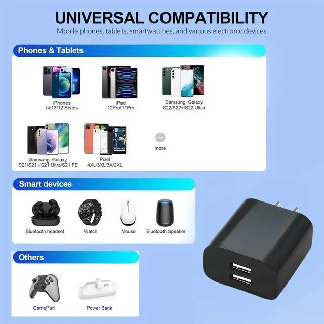 Support dual devices charging at the same time, 5V/2.1A stable output, adapts to 100-240V wide voltage.