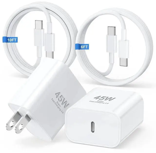 [45W USB-C Super Fast Charger] This powerful 45W USB-C iPhone charger is specially designed for iPhone 16 15 Series. It features a 45W Power Delivery (PD) port and includes USB-C to USB-C cables (6ft & 10ft). Charge your iPhones/ android device from 0% to 100% in just 60 minutes up to 3x faster than a standard type c charger.