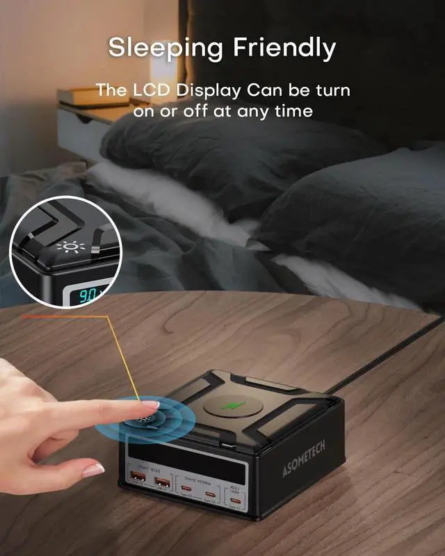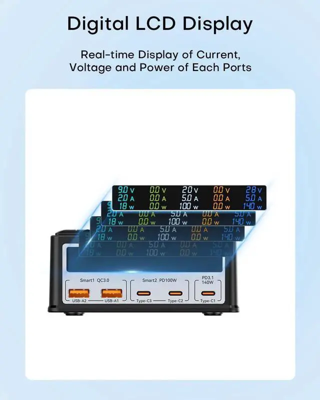 The multi usb charger supports wireless charging, 5 ports usb fast charging, realizing simultaneous charging of multiple devices at the same time.USB charging station equipped with a lcd display, can clearly see the voltage and current and power of each port. The multiport usb charging station built-in GaN III technology.Provide fast charging speed.The charging station has an automatic allocation function. Each time a port is inserted, the charging speed will be automatically adjusted according to the device. Support PD 140W Fast charging.In addition. The screen also has a touch button, which can be turned on or off at any time, even at night without disturbing sleep. It is a good partner for family and office.