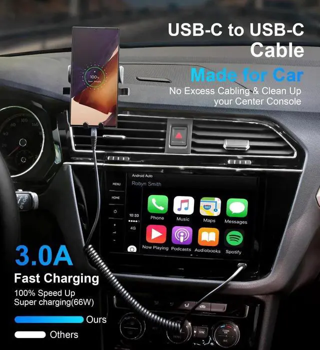 The cable is USB-C to USB-C Made for car 3A fast chaging: Type C fast charging cable supports PD3.0 and QC3.0 fast charging with a max 60W (20V 3A) output 480Mbps (40-60MB/s) Transfer Speed 20,000+ Bend Lifespan Certified Safety More tightly connected to usb c port: the connection is firm, even when the car is driven on rough and bumpy roads