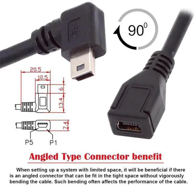 Used to connect USB Mini cables in tight fit applications. Can work for all mini USB 5pin device extension.