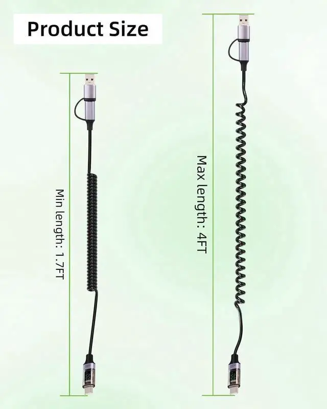 USB C to USB C Coiled Cable,using stretchable design, no winding, no knotting,no space occupation, automatic rebound fast,easy to carry and use,original length: 0.5M/1.7Ft, stretching length: 1.2M/4Ft