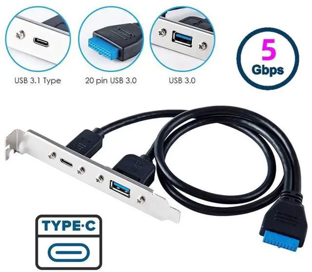 JAENFONG High Speed USB3.0 Motherboard 19/20Pin to USB-C Type-C & USB 3.0 Dual Ports Female PCI-E Back Panel 5Gbps Cable 50cm