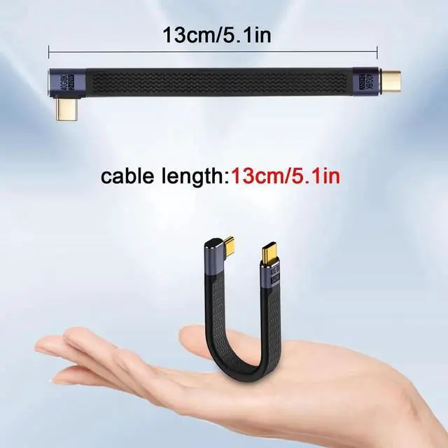 [90 Degree Angle Short Cable]USB4.0 C Male to 90 Degree Angle USB4.0 C Male Flat Short Cable, cable length is13cm (5.1in), short and lightweight, soft and durable, perfect for connecting your cell phone to the Power Bank for charging.90 degree side angle design, easy to run the cable in a small space.
