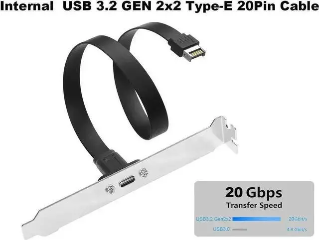 USB 3.2 Internal Motherboard Type-E to Type-C extension cable with PCI bracket Compatibility with USB 3.2 Gen 2x2,Data Transfer Speed up to 20Gbps Backward-compatible with USB 3.2 Gen 2 10Gbps and USB 3.2 Gen 1 5Gbps Supports Max 5V/3A Charging Panel-mounted USB-C female connector enables you to connect all USB Type-C ready devices such as phones, tablets, flash drives, mouse, hubs, and other USB-C peripherals With Full-Profile PCIe Bracket Cover for computer case installation Note - Does not support DP ALT Audio and Vidoe output and thunderbolt