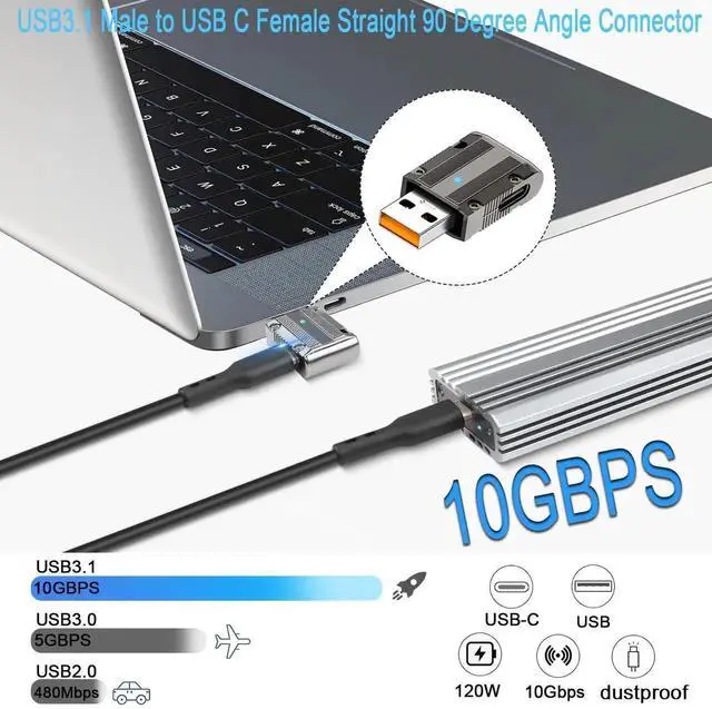 [LED Lights + Hanging Hole]120W USB3.1 plug to USB C jack 90 degree angle Adapter. Zinc alloy shell, sturdy and durable.Double sided LED indicator light, light up when working. With hidden hanging buckle hole, easy to carry, not easy to lose.