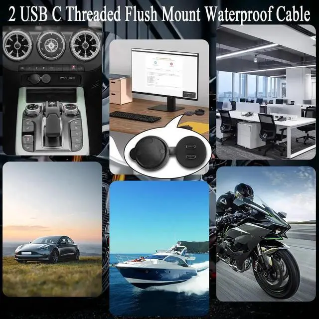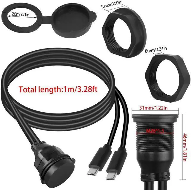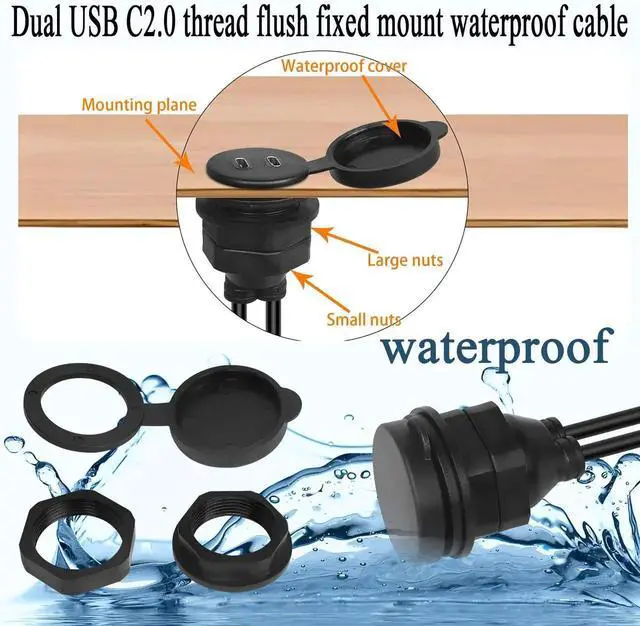 [Double thread fixing]Dual USB C2.0 thread flush fixed mount waterproof cable, comes with M26×1.5 thread, and double nuts, only need to cut a 27mm hole on the board surface, fixed with nuts to achieve the extension and expansion of USB C port. The double nuts prevent loosening.