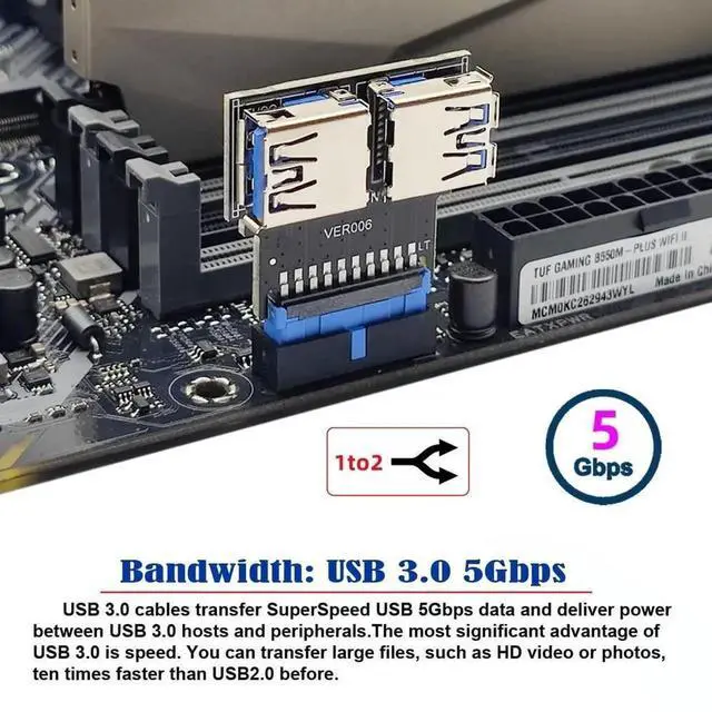 This USB 3.0 pin header adapter can be plugged to a free USB 3.0 pin header male of your mainboard in order to expand your system internally by two USB 3.0-A ports.