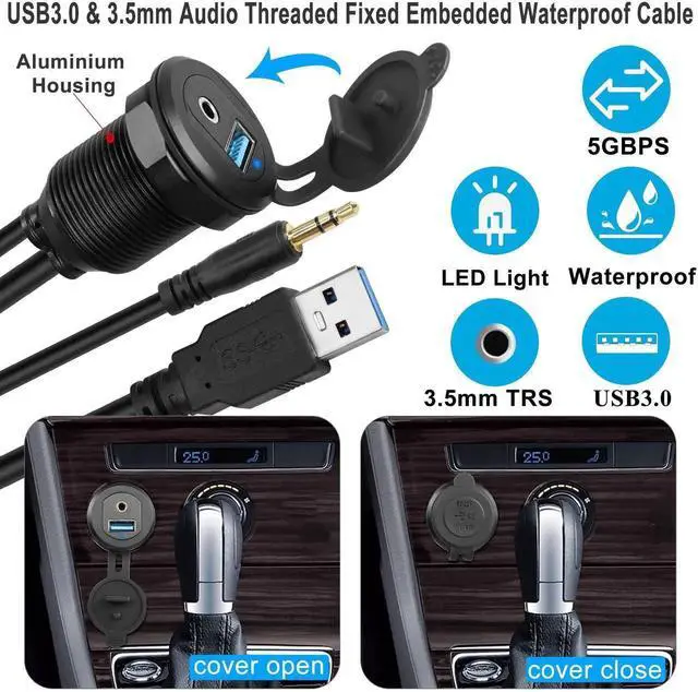 JAENFONG USB3.0 & 3.5mm Audio Threaded Fixed Embedded Car Waterproof Cable 5Gbps TRS 3.5mm & USB3.0 Dashboard Panel Mount Extension Cable, LED Lights, Al Housing, for Car Boat Motorbike,2M/6.5ft
