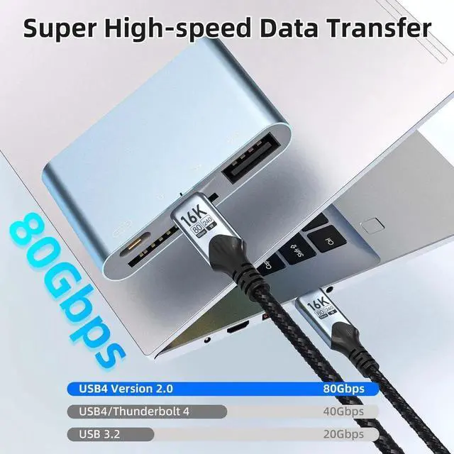 The USB5 male-to-male cable supports ultra-high-speed transmission at 80Gbps. (Note: This maximum speed can only be achieved when both your data transmission device and data source support 80Gbps.) It is twice as fast as USB4 and enables lightning-fast transfer of 16K videos, large files, and gaming data. This USB-C data cable is backward compatible with USB4/3/2 devices, ensuring seamless connectivity across all generations of devices