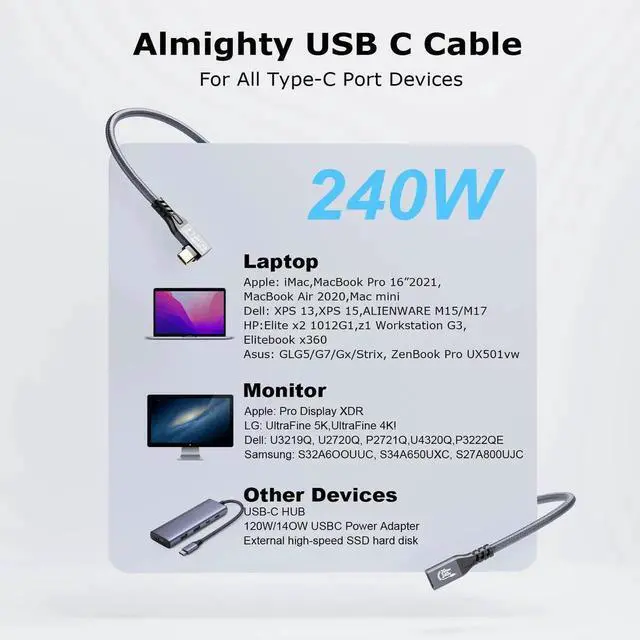 [20Gbps USB C 3.2 Extension Cable]USBC 3.2 Gen2 20G 240W Ultra 4K Video,This USB3.2 Male to Female Cable enable you to connect from your Laptops with USB-C Port(DP Alternate Mode for video supported)to your External Monitors with USB-C Port,you need to connect an external USB3.2 Male/Male cable for connection to your laptops or Displays,M/M USB-C3.2 Cable is not included in our Package
