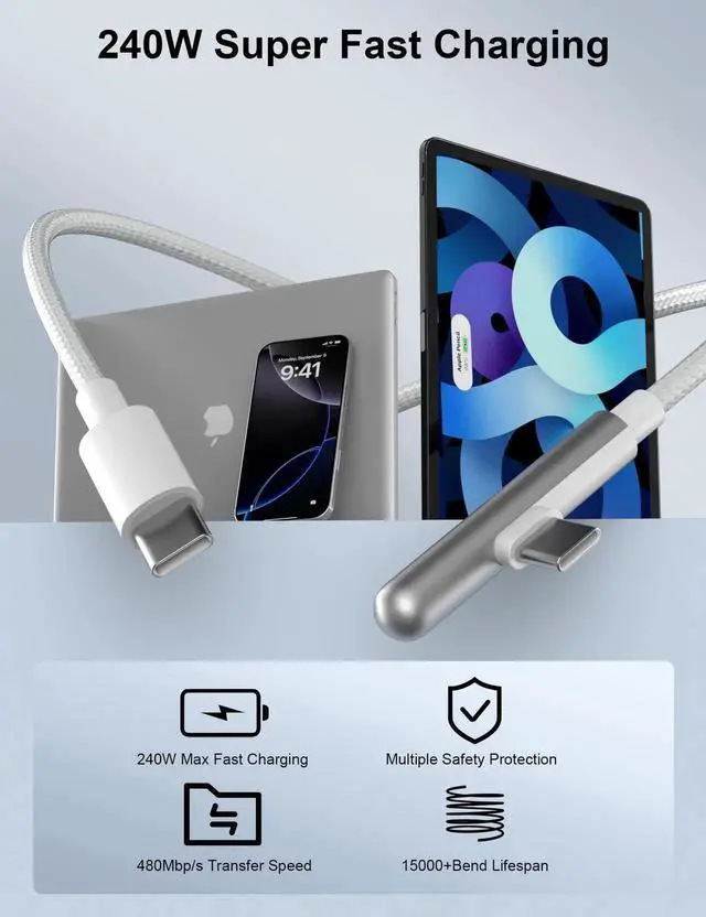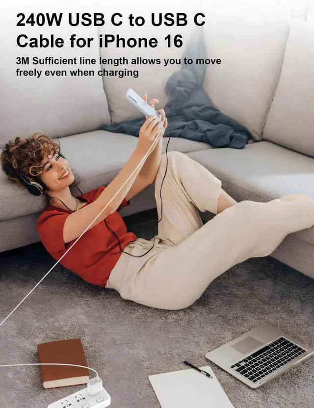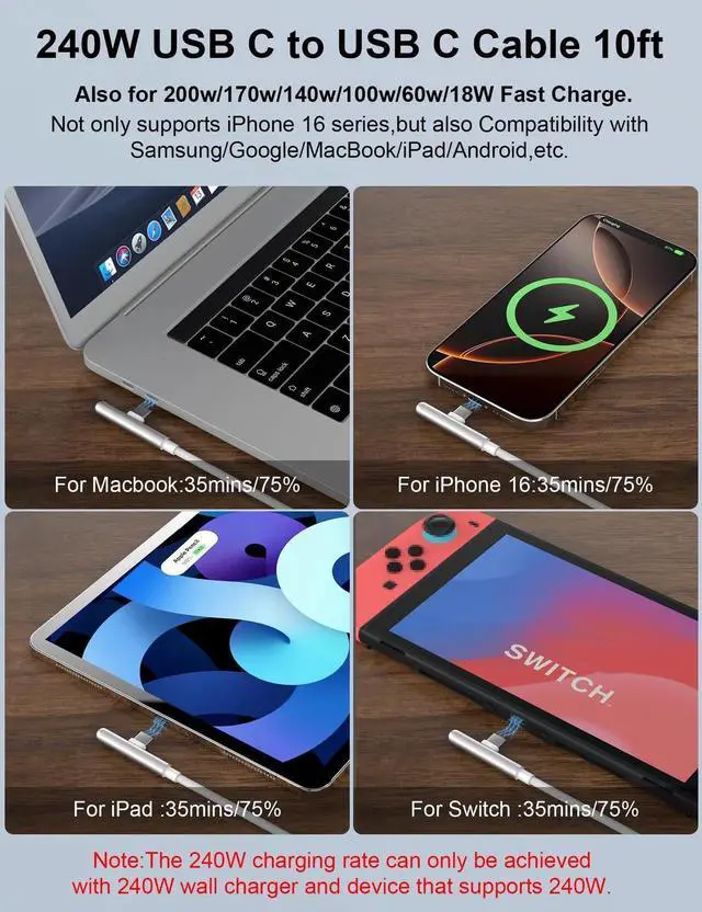 • 240W Super Charging Speed:This usb c cable 10ft supports 240W Max PD fast charging,can work together USB-C Power adapter compatible with 140W/100W/65W/60W/45W/25W/18W all USB C port devices.it can fast charge for iPhone 16 Pro up to 80%,iPad Pro up to 75% in 40 minutes. and USB 2.0 standard ports support 480 Mbps data transfer rates for fast uploading of resources