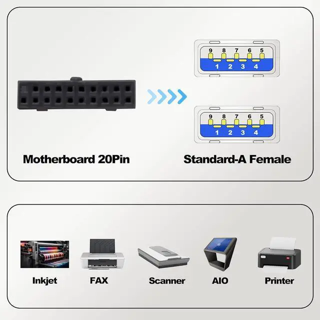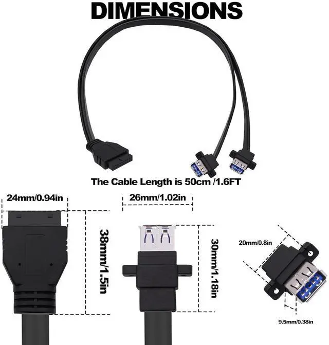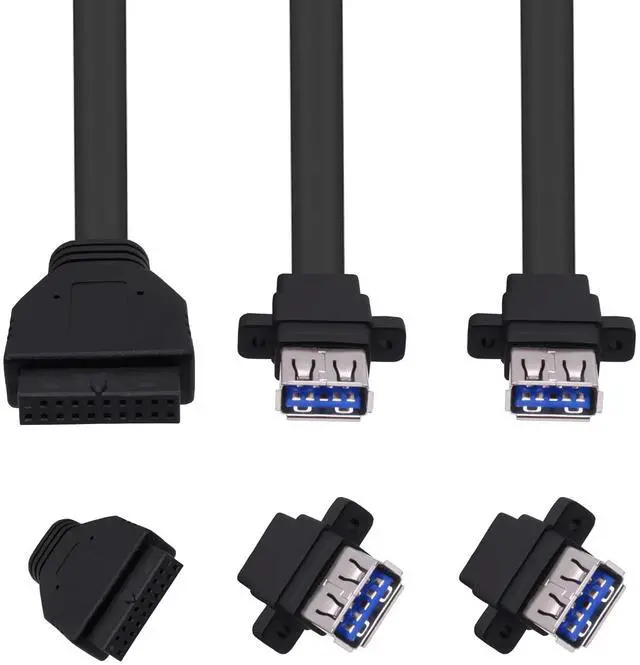 USB 3.0 to 19 Pin adapters cable can expand 19/20 pin USB 3.0 interface of the motherboard to 2 standard USB 3.0 A-type female ports, support the connection of various peripherals such as USB flash drives, portable hard drives, printer,card reader,shard drives, USB hubs,smartphones etc. Support Windows, Mac, Linux, etc.system.