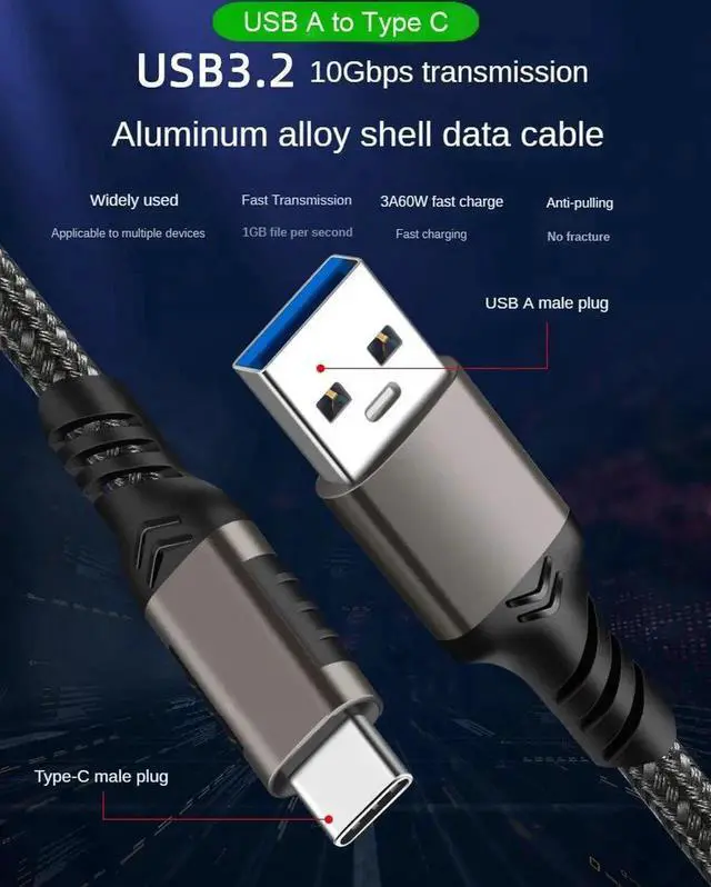USB 3.2 10Gbps Cable USB Type A to USB C 3.1 / 3.2 Gen2 Cable Data Transfer USB C SSD Hard Disk Cable 3A 60W QC 3.0 Fast Charging