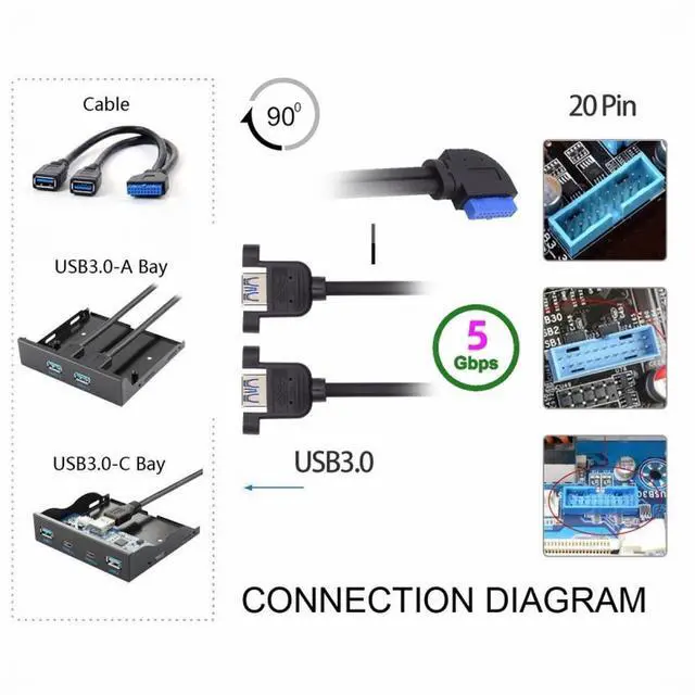 Angled 19/20Pin Header to USB 3.0 Dual Ports Female Screw Mount Type-Cable 90 Degree 5Gbps