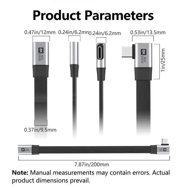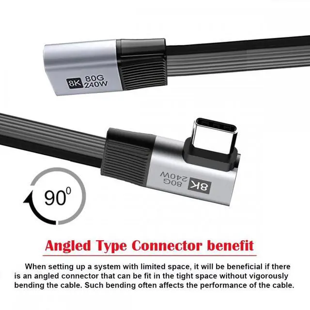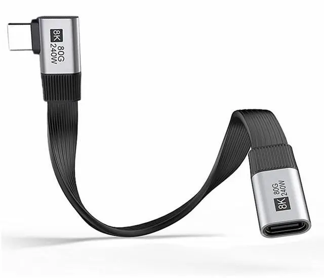 • 20cm USB5.0 80Gbps Flat Slim FPC Male to Female Extension Cable Right Angled 90 Degree 240W 16K 8K 60Hz 5K Compatible with 40Gbps USB4.0 Thunderbolt3/4/5