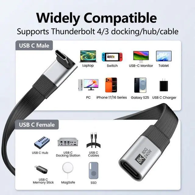 This USB5.0 Type-C Cable is widely compatible with Most of USB-C Devices (Mainly Laptops), Such as Mac Pro 2018-2025,XPS, ChromeBook and other DP Alternated Mode Supported Devices, backward compatible with Thunderbolt3/4/USB4, You can also connect with SSD Drivers and Docking Stations for Data.