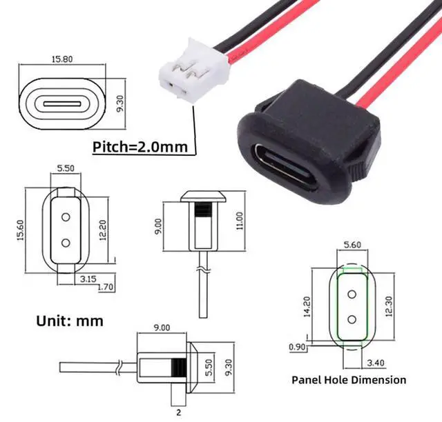 5 Pack 2.0mm Pitch 2Pin to USB C Female DC 5V 3A Flush Mount Charging Socket Port Conversion Cable Adapter