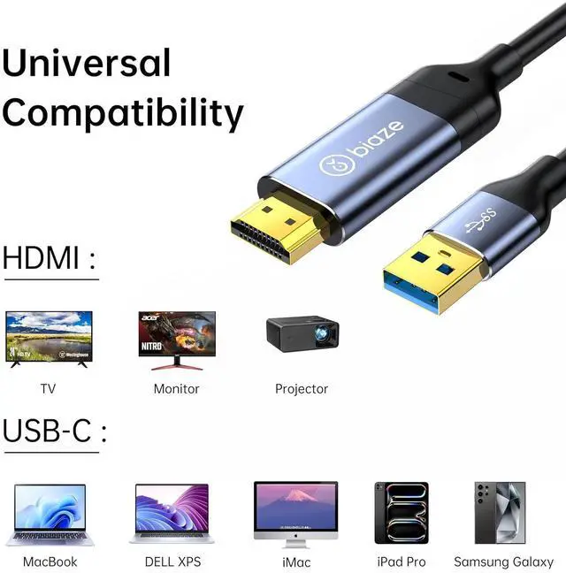 USB 3.0 to HDMI SuperSpeed Bridge Upgrade from outdated USB 2.0 with our USB to HDMI Cable achieving 5Gbps speeds - 10X faster data transfer for lag-free gaming and 4K-ready streaming. Essential for PS5/Xbox Series X gamers and content creators demanding real-time rendering.