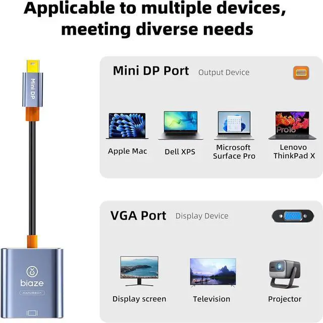 Universal Compatibility & Effortless Plug-and-Play This Mini DisplayPort to VGA converter offers broad compatibility, effortlessly connecting your Apple MacBook Pro, MacBook Air, iMac, Microsoft Surface Pro, and D-ell XPS laptops to any VGA-equipped monitor, projector, or HDTV. The plug and play design requires no drivers for instant setup.