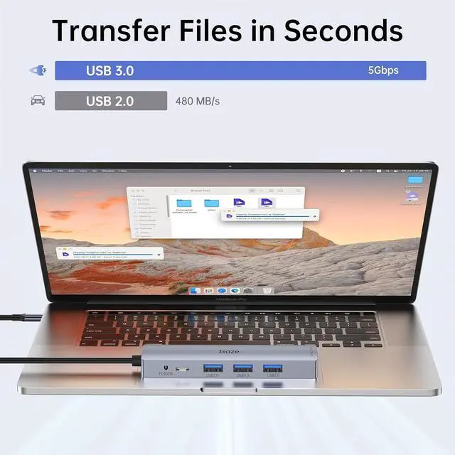 100W PD Fast Charging & Efficient Expansion in One This Thunderbolt 4 dock delivers continuous power and comprehensive connectivity. With 100W Power Delivery (PD) pass-through charging, your MacBook Pro or MacBook Air stays fully charged while you work. Simultaneously, three USB 3.0 ports (5Gbps) instantly transform your device into a complete workstation, seamlessly connecting flash drives, external hard drives, keyboards, and miceall with effortless integration. This USB-C docking station is the ultimate adapter for Mac users.