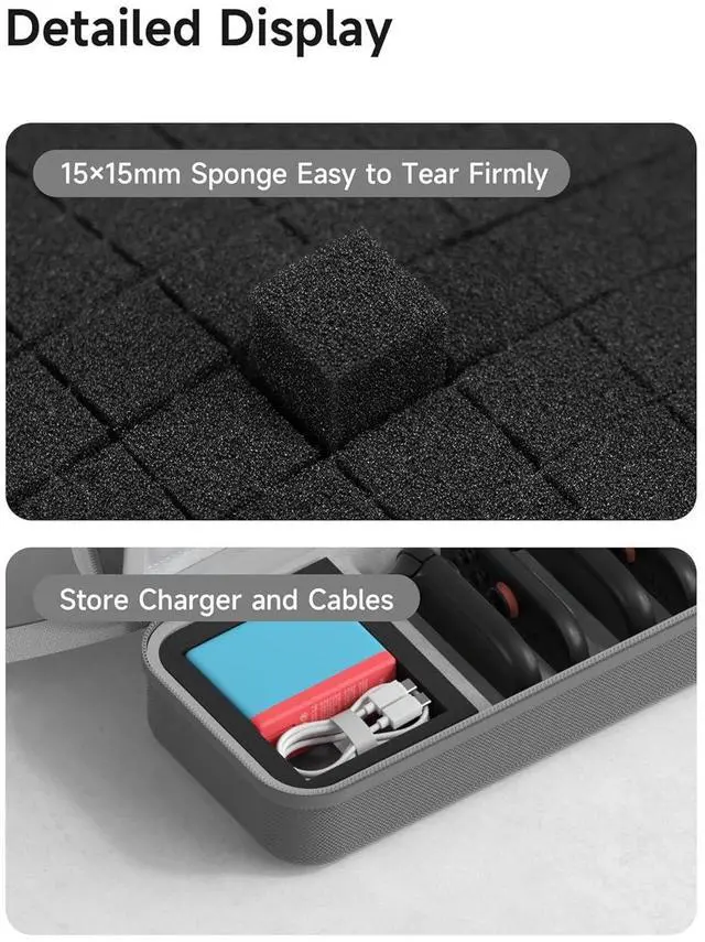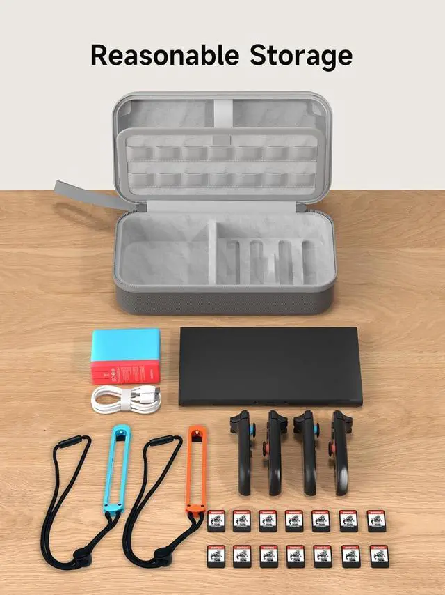 • Partitioned Storage: eStorage Case for Switch 2 has multiple internal partitions designed to store Switch 2, charger, cables, 4 Joy-Cons and 14 Game Cartridges. Large storage is suitable to take all the accessories which you need to go on a trip