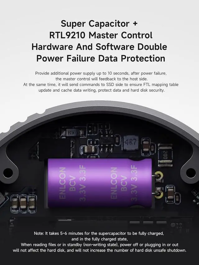 Dual Power Outage Protection: Supercapacitor+RTL9210 main control, with dual software and hardware power outage data protection, providing an additional 10 seconds of power supply. After power outage, the main control will provide feedback to the host end and send instructions to the SSD end to ensure FTL mapping table updates and cache data writing, protecting data and hard disk security. *Note: It takes 5-6 minutes for the supercapacitor to fully charge. When fully charged, it will not affect the hard drive when reading files or in standby mode (not in write mode), power off or unplugging, and it will not increase the number of unsafe shutdowns on the hard drive