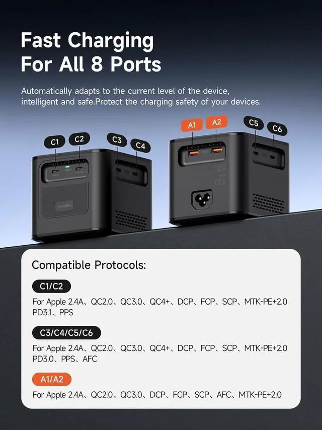 Compatible With Multiple Fast Charging Protocols: C1/C2 port compatible with Apple 2.4A, QC2.0, QC3.0, QC4+, DCP, FCP, SCP, MTK+PE+2.0, PD3.1, PPS; C3/C4/C5/C6 port compatible with Apple 2.4A, QC2.0, QC3.0, QC4+, DCP, FCP, SCP, MTK+PE+2.0, PD3.1, PPS. MTK+PE+2.0, PD3.0, PPS, AFC; A1/A2 port compatible with Apple 2.4A, QC2.0, QC3.0, DCP, FCP, SCP, AFC, MTK+PE+2.0