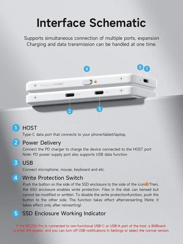 Write Protect Key: MC200 SSD Case has one key push and pull to turn on and off, after turning on the Write-protect function, the files in the ssd can only be read, can not be modified or written, to prevent the files from being damaged or infected with viruses