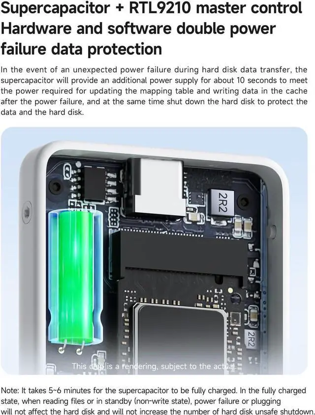 Dual Power Outage Protection: Supercapacitor+RTL9210 main control, with dual software and hardware power outage data protection, providing an additional 10 seconds of power supply. After power outage, the main control will provide feedback to the host end and send instructions to the SSD end to ensure FTL mapping table updates and cache data writing, protecting data and SSD security. *Note: It takes 5-6 minutes for the supercapacitor to fully charge. When fully charged, it will not affect the SSD when reading files or in standby mode (not in write mode), power off or unplugging, and it will not increase the number of unsafe shutdowns on the SSD