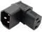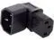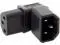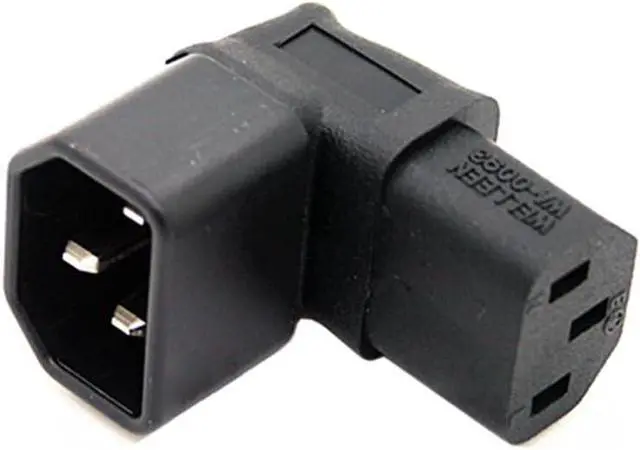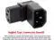 An angled power connector. The plug type for this adapter is IEC 320 C14 to C13, featuring a 90-Degree Angle AC Converter design with an IEC 3-Pole Male to Female 90-Degree Angle Configuration.