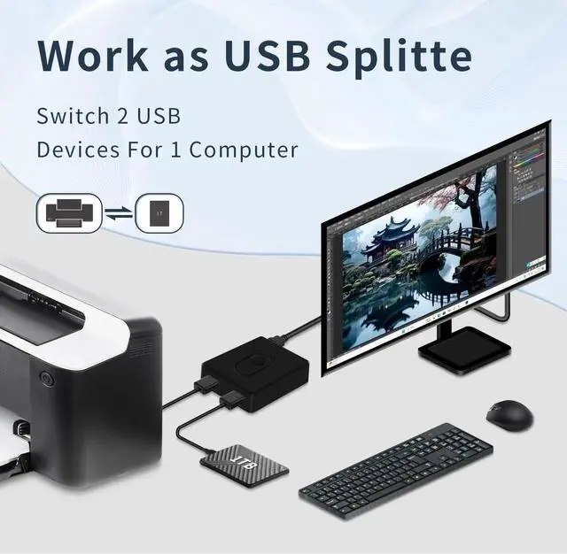 USB 3.0 Bidirectional Switcher This USB switcher allows to share and switch one USB device between two computers or two USB devices to one computer. Examples of USB devices include printers, USB stereos, keyboards, card readers, removable hard disks, and more.
