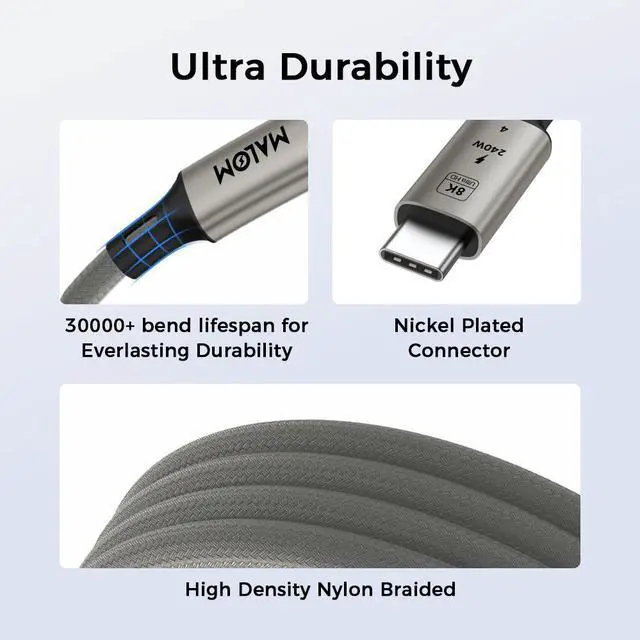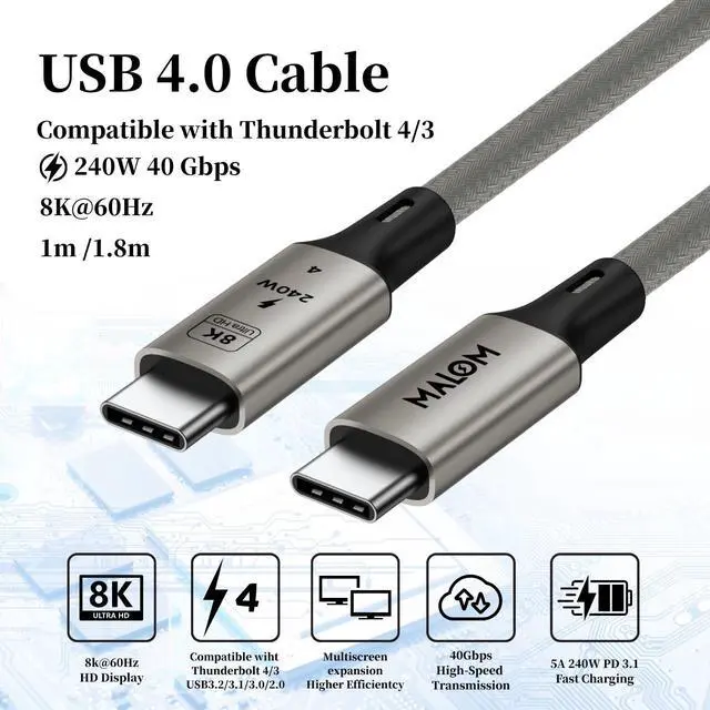 This USB 4.0 USB-C to USB-C cable supports data transfer speeds up to 40Gbps and is compatible with Thunderbolt 4 and Thunderbolt 3 devices when used with supported hosts. It supports up to 240W USB Power Delivery (PD 3.1, 48V/5A) for high-power charging of laptops, tablets, and smartphones, and supports video output up to 8K at 60Hz with compatible displays and systems. Built with a durable braided jacket, reinforced connectors, and an integrated E-Marker chip, the cable is designed for stable performance, efficient power negotiation, and reliable daily use. Available in 1m and 1.8m lengths.