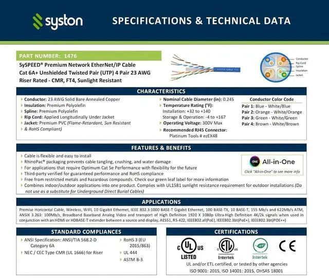 Certified and Compliant with Industry Standards - Standard compliances and certifications - ANSI/TIA 568-2.D, Category 6A, NEC/CEC type CMR (UL1666) for riser, UL and/or ETL listed and RoHS compliant.