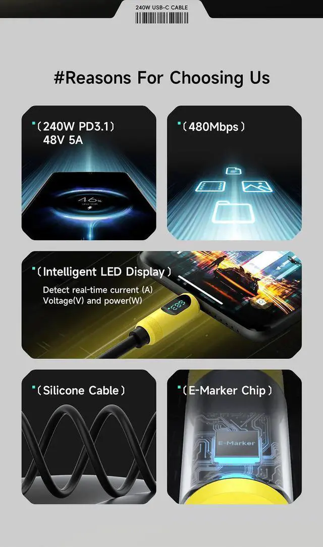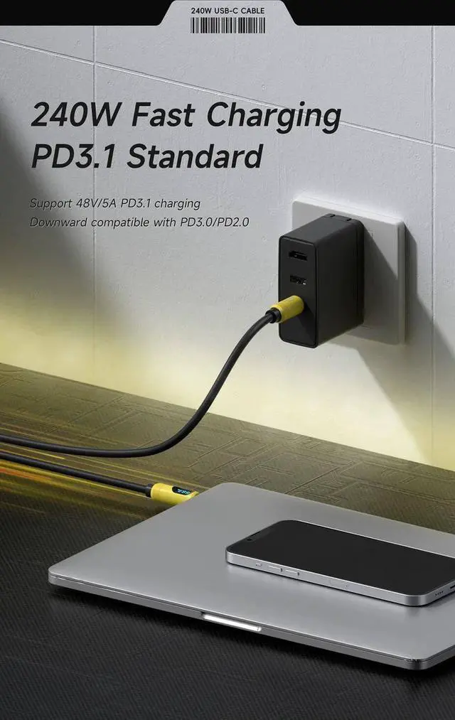 This cable supports charging speeds of up to 240W (48V 5A). The USB C to USB C cable can charge any Type-C device, from smartphones to laptops. It is compatible with the PD3.1 fast charging protocol and supports backward compatibility with PD3.0/2.0. And also compatible with 140/100/60W power devices. Charge USB C devices from phones to laptops.