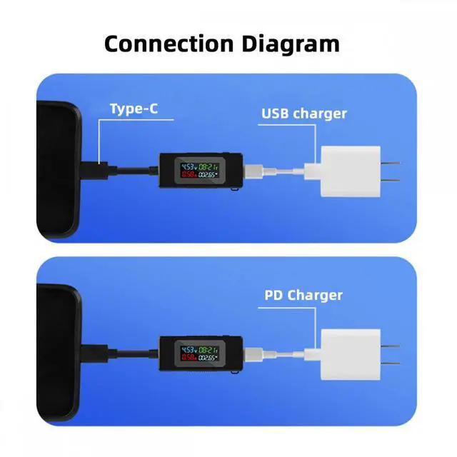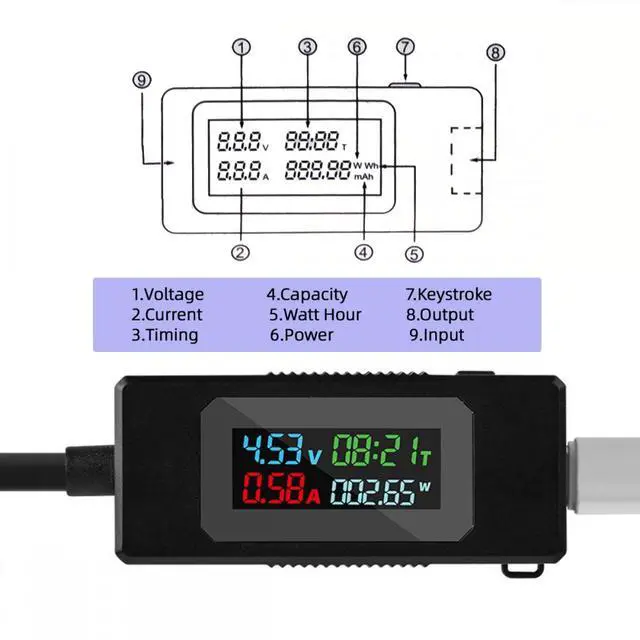 3) Multi-function: This USB tester is designed to detect voltage, current, capacity, electric quantity, power, temperature, resistance, charging time and other data of the USB C devices, which is convenient for testing power supply and quality.