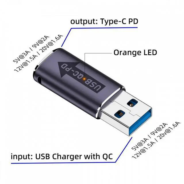 Input Type-A 5V 3A charger without QC and output 5V3A Type-C PD Power.(Green Led will be light)