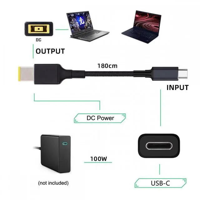 100W Type-C USB-C Input to Rectangular Jack Output Power 20V 5A 65W PD Charge Cable for Thinkpad X1 Legion Y7000P Laptop