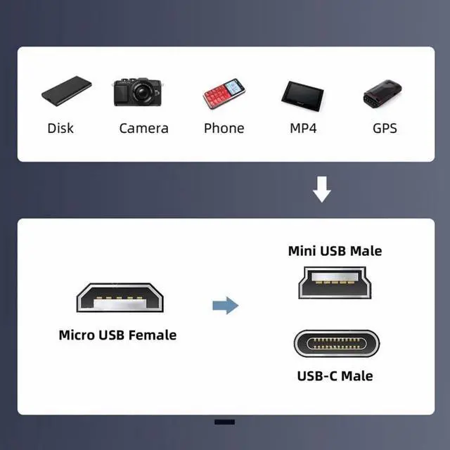 It can convert the micro usb port to mini/usb-c port.