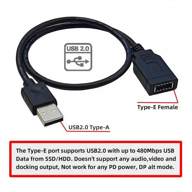 The Type-E port supports USB2.0 with up to 480Mbps USB Data from SSD/HDD. Doesn't support any audio,video and docking output, Not work for any PD power, DP alt mode.