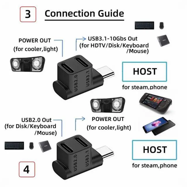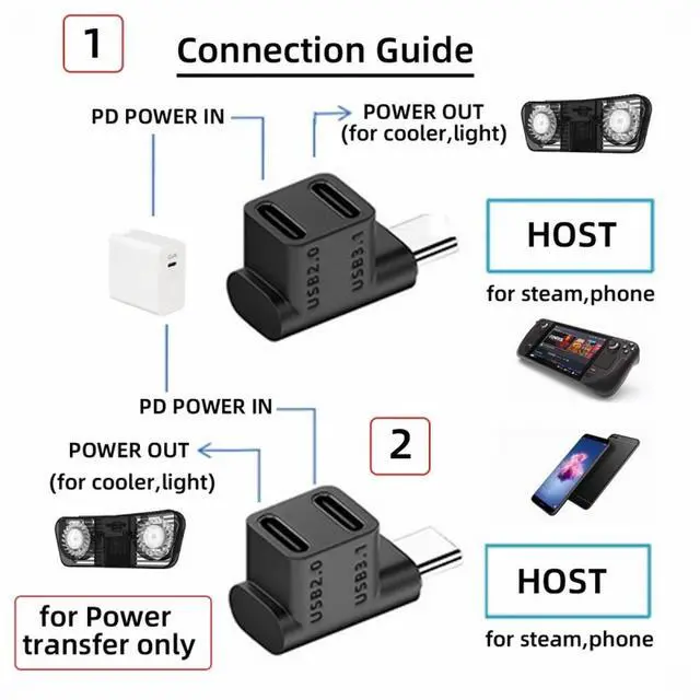 The adapter also work for Steam one USB3.1/USB2.0 out and one power out to cooler and light.