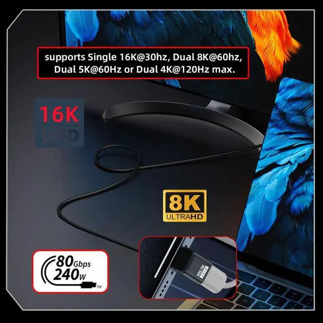 This USB5.0 adapter enables to connect from your USB5.0/USB4.0 or thunderbolt3/4/5 Port equipped Devices to your USB-C Monitors, It supports Single 16K@30hz, 8K@60hz, 5K@60Hz or 4K@120Hz max. video Resolution in your external displays.(please make sure your monitor's Type-c port support DP Alternate Mode for Video.)