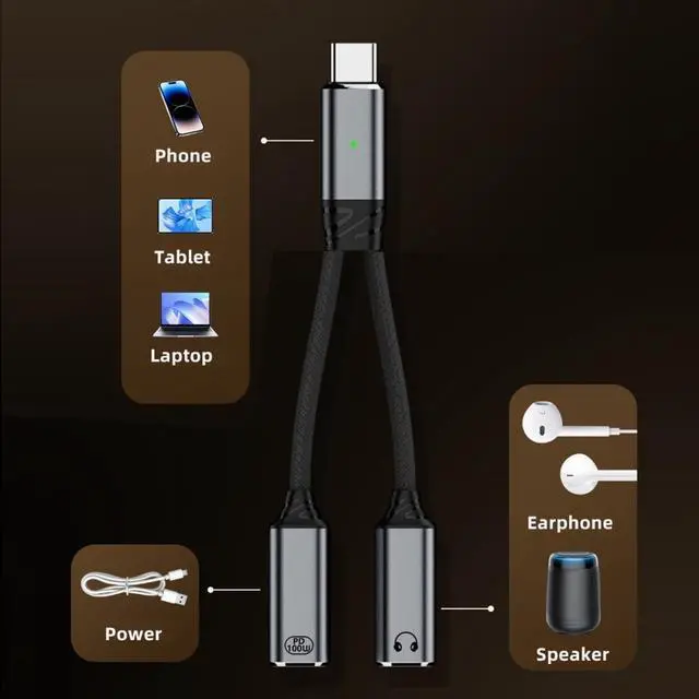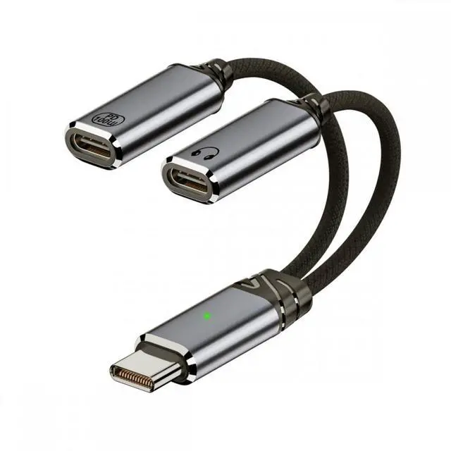 USB-C Type-C Male to Dual Female Audio DAC AUX Music 16bit 48kHz and 100W PD Power Cable for Laptop Tablet Phone