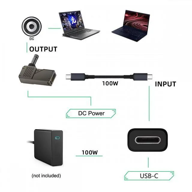 Practical 100W Power Delivery,This adapter can support Max 100W 20V/5A Charging, It will supply USB-C power when your DC Laptop device is in use.