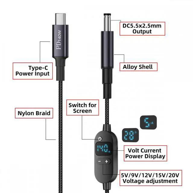 Type-C USB-C Input to 20V 15V 12V 9V 5V DC 5.5*2.5mm Output Power Smart LED Display 100W 140W 65W PD Charge Cable for Laptop