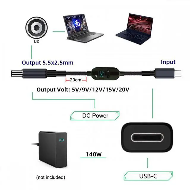 Output: DC5.5mm Male and DC20V 7A 140W Max.(Also support DC5V 9V 12V 15V power output with botton); Use it with the 140W Type-C Charger to charge your Laptop with DC 5.5mm port;