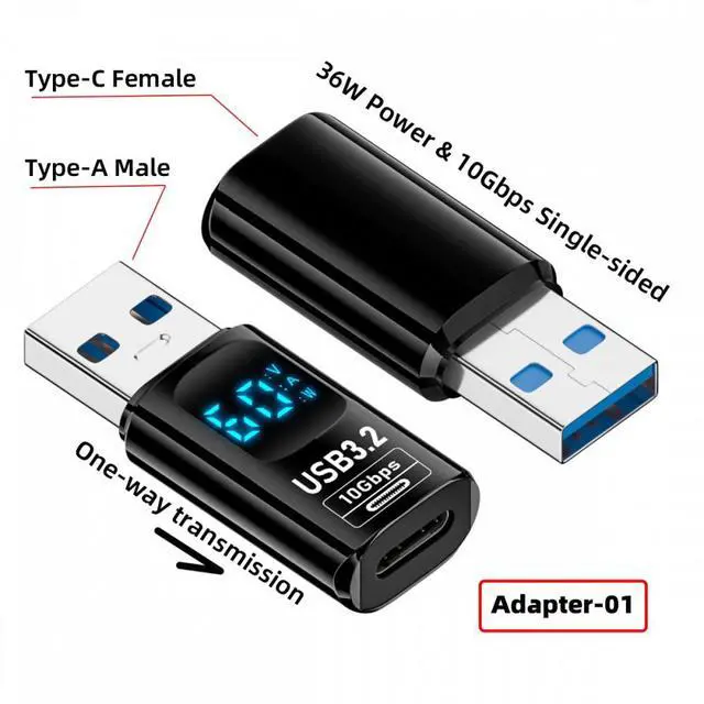 3pcs/lot Type-C Smart LED Display USB-C to USB3.2 Type-A Adapter 10Gbps Data Current Voltage Fast Charging Monitoring Display Tester Detector