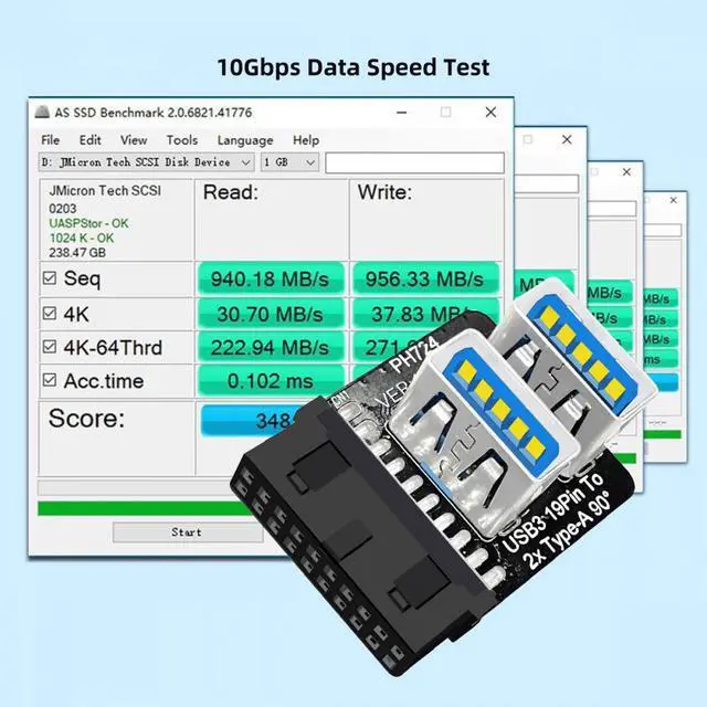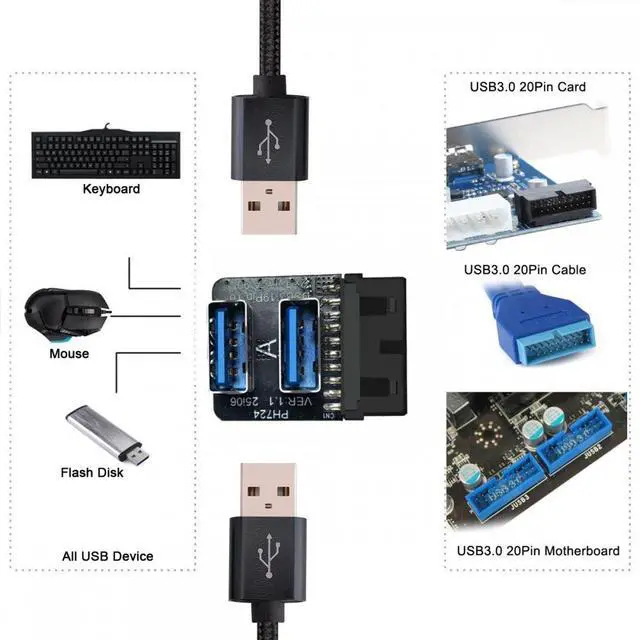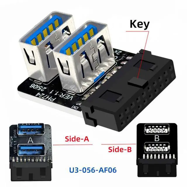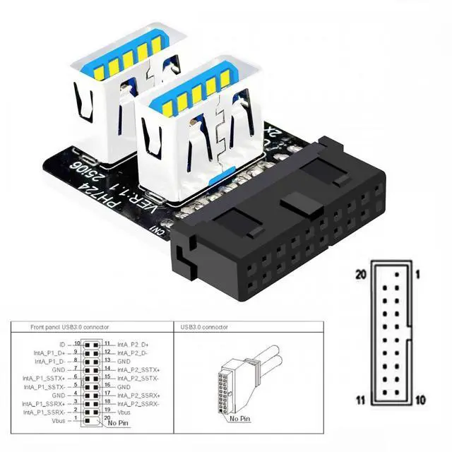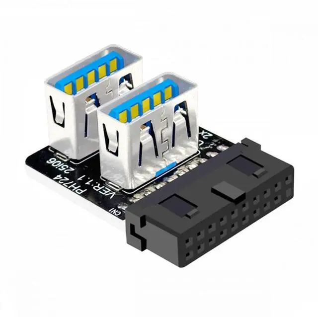 Dual USB 3.0 A Type Female to Motherboard 20/19 Pin Box Header Slot Adapter 10Gbps Vertical Type-Card 90 Degree Forward Angled