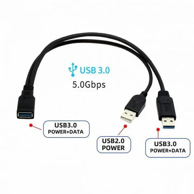 Black USB 3.0 Female to Dual USB Male Extra Power Data Y Extension Cable for 2.5" Mobile Hard Disk