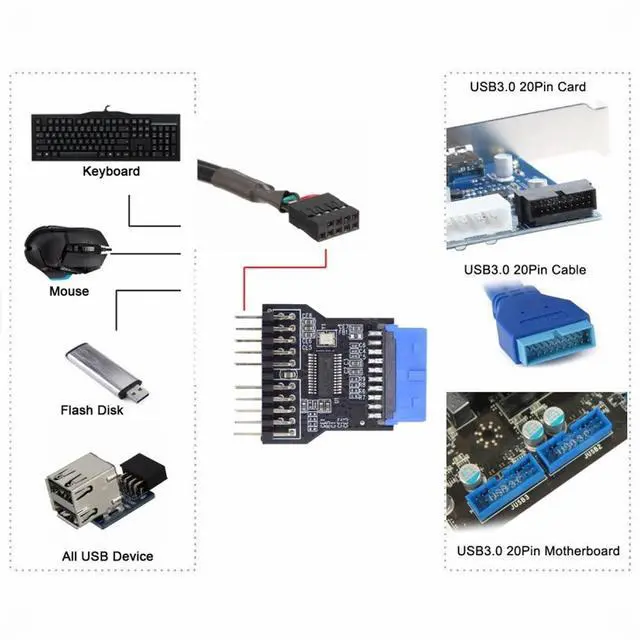 Desktop 19-Pin USB3.0 HUB to USB 2.0 9 pin Connector Adapter Port Multilier